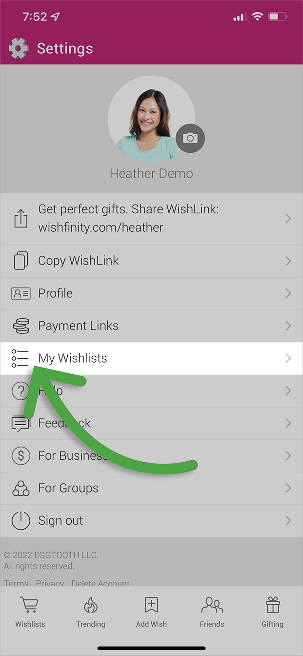 1. From your Settings page, tap “My Wishlists.”