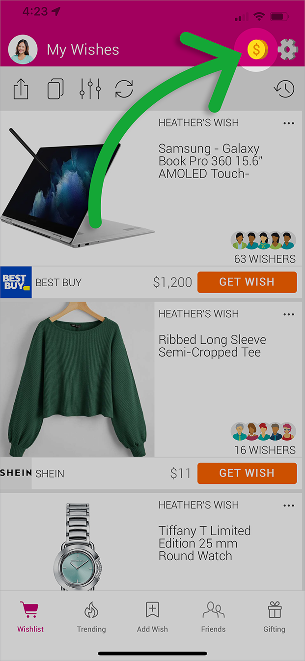 1. Tap on the Coin icon in the top right corner of your Wishlist page.