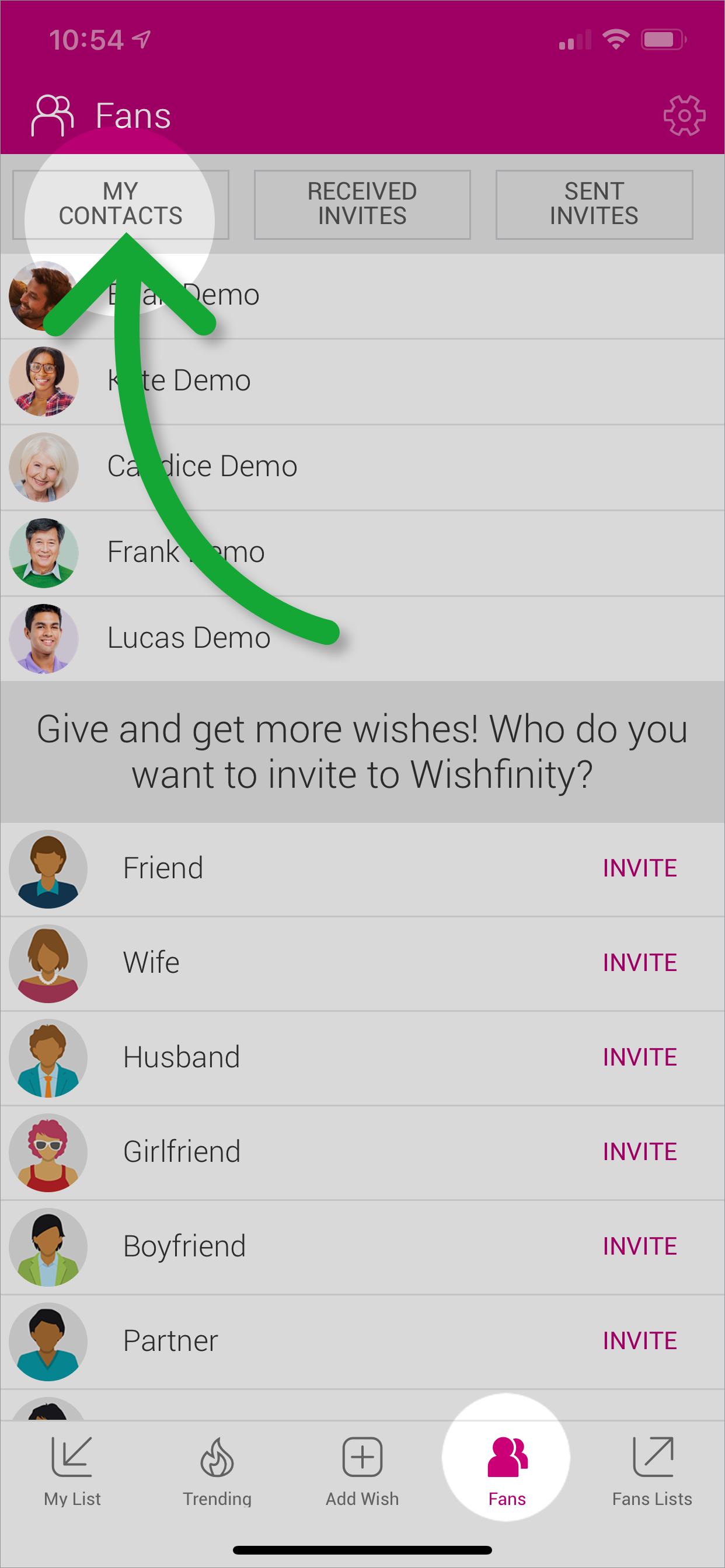 1. From the Friends page, tap the “CONTACT” button in the to right corner.