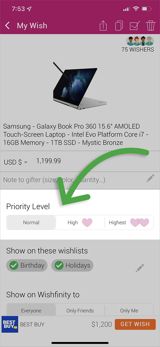 Wishfinity lets you organize and sort your wishes by three levels of priority: Normal, High, and Highest.